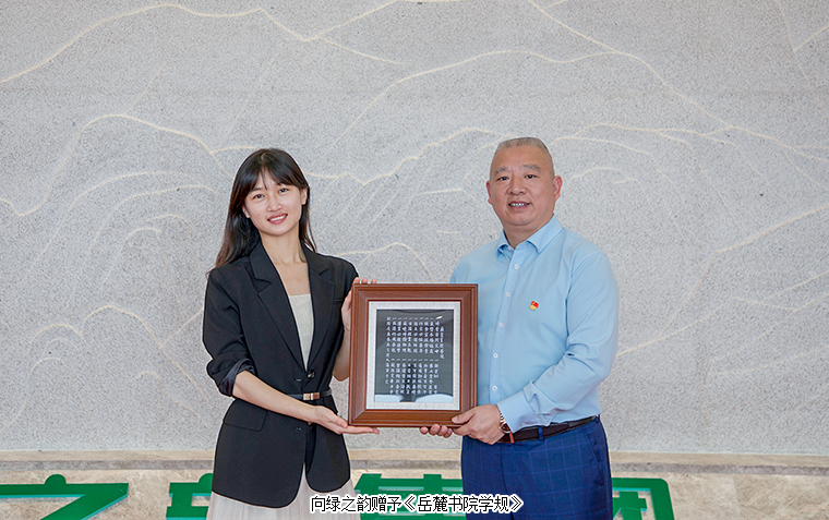 座谈会上,胡均安常务副总裁对毛老师和同学们的到来表示热烈欢迎。梅其慧常务副总经理作主题分享,并对同学们提出的“绿之韵的企业发展理念”“人才管理培养体系”“企业文化建设”等方面问题,一一予以详尽解答。毛老师和同学们纷纷表示,在绿之韵人的眼睛里看到了光,这是对公司企业文化的认同感,也是绿之韵坚持企业培训和人才信念的匠心。交流尾声,毛老师代表湖南大学工商管理学院EDP中心向绿之韵赠予代表千年学府历史文脉的《岳麓书院学规》。