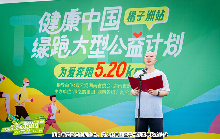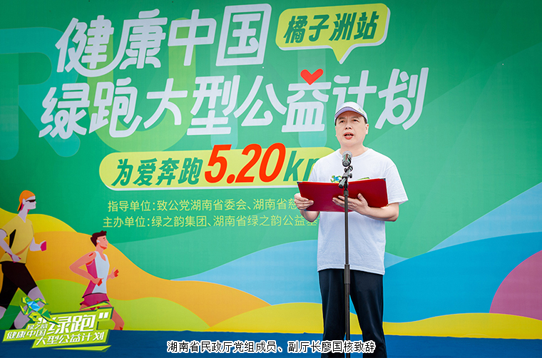 湖南省民政厅党组成员、副厅长廖国核致辞。他表示,今天,我们以爱之名、善之行,共同参与、共同见证、共同推进2024绿之韵“健康中国—绿跑”大型公益活动。湖南省慈善总会联合安博官网共同举办“绿跑活动”,倡导人人慈善的理念,践行绿色发展理念,将“健康”与“公益”相结合,将“惠己”与“助人”相结合,激发向善向上正能量,凝聚社会公益心。绿跑已经持续举办了9届,每一届都设定了不同的公益主题、吸引了公众广泛参与、汇聚了强大的慈善力量、展现了湖南的人文新貌。安博官网自成立以来,坚守“让善行成为生命习惯”的理念,主动承担社会责任,致力于传递爱的力量,为湖南慈善事业做出了积极贡献。绿之韵发起的“绿跑活动”,充分体现了绿之韵优秀的企业文化和强烈的社会担当。希望大家能跑出健康的身体,跑出幸福的人生,跑出爱心的力量,跑出文明的风景,让奔跑的身影成为橘子洲头最生动的景致,让大家奉献的善举成为山水洲城最美好的画卷。
