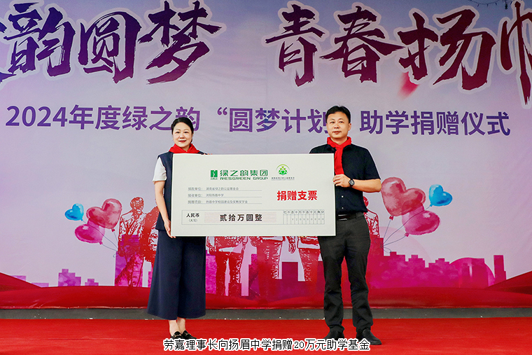 劳嘉理事长表示,捐资助学是善举,兴学育人是美德。教育帮扶一直是绿之韵公益基金会的重要关注点之一。绿之韵成立21年来,在胡国安董事长的倡导下,始终坚持承担社会责任,坚守“让善行成为生命习惯 ”的理念,致力于传递爱的力量。在绿之韵第五个五年规划发展时期,集团捐赠1000万设立“绿韵圆梦”爱心基金。此次捐资20万用于帮助扬眉中学少年宫文化建设和设立助学助教奖学金便是我们“绿韵圆梦”行动重要的实践之一。未来,我们还希望影响和带动更多有爱心的人士参与到捐资助学行动中来,帮助青少年健康成长,为浏阳教育事业高质量发展作出积极贡献。
