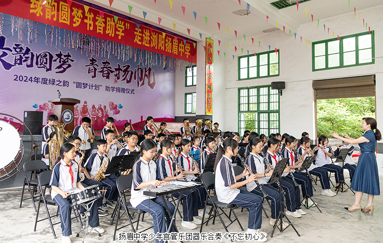 活动中,浏阳市镇头镇扬眉中学党支部书记、校长万锦春带领领导嘉宾参观了学校基础设施建设和特色教室,并对学校的发展和办学理念进行了详细介绍。暖暖爱心,点亮希望之星;片片真情,托起明日朝阳。在激昂振奋的曲调中,扬眉中学少年宫管乐团器乐合奏了一首《不忘初心》,表现出少年儿童向真、向善、向美、向上的精神风貌。随后,学生代表向参加本次捐赠活动的嘉宾和领导们敬献红领巾和鲜花,用最质朴的行动向所有爱心人士表达了诚挚的感谢。