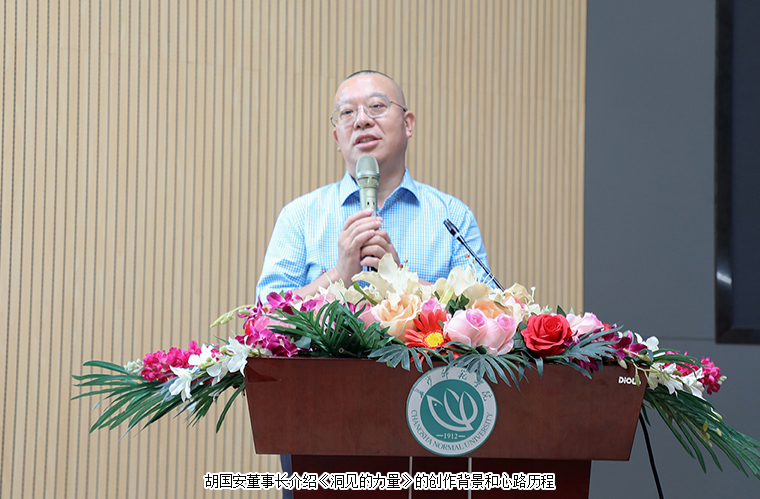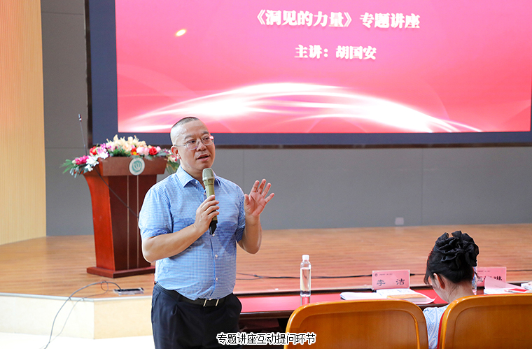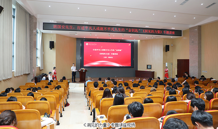 中共长沙市委统战部副部长、市侨办主任杨光华就专题讲座发表了见解。他认为,《洞见的力量》这本新书的出版,汇聚了胡国安先生的一种格局和力量,这种格局是胸怀国家的,释放出精神的力量、信仰的力量、文化的力量和智慧的力量。是对“穷者独善其身,达者兼济天下”最好的诠释。胡国安先生不仅把企业做大做好,也能够影响和带动身边更多的人一起创业,去实现梦想。在他看来,与“看见”二字不同,“洞见”需要的是智慧、思考,是更深的一种综合体验能力,能看见别人看不见的东西。《洞见的力量》向我们讲述了民营企业走向成功的十二大发展引擎,他认为无论是过去还是当下创业都是艰难的,都需要有智慧和洞见的能力和才华、需要有坚持的力量、更需要常怀感恩之心,与善同行、与爱同行。“真正的大爱,不是简单的给予,而是去搭一座桥,铺一条路,让更多的人,抵达梦想的栖息地。”一如书中所说,他勉励大家能向胡国安先生学习,继续传扬和践行家国情怀以及大爱精神,相信这本书可以点亮大家的创业梦想,希望同学们在做好本职工作的同时,都能有余力去实现自己的理想,学以致用,学有所成。