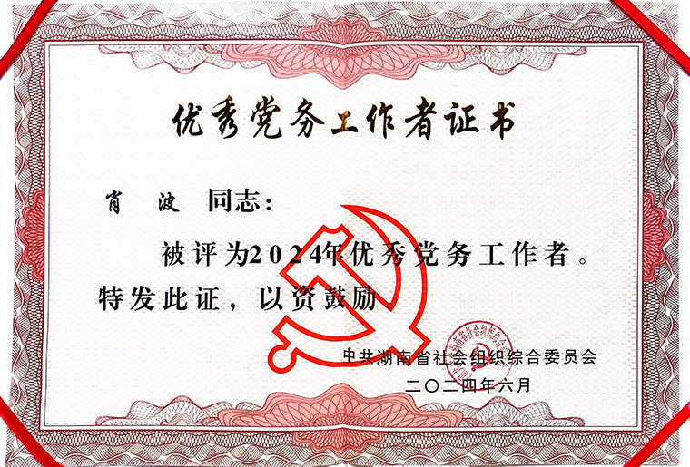一直以来,在湖南省社会组织综合党委和省民政厅社会组织管理局的关心与支持下,中共湖南省绿之韵公益基金会党支部始终坚持以习近平新时代中国特色社会主义思想为指导,强化政治引领作用,不断推进党支部的标准化、规范化建设,将党建工作与基金会发展同谋划、同部署、同实施,实现了党建与基金会发展的双促进、双提升。肖波书记表示,此次获得“优秀党务工作者”称号,既是对个人荣誉的表彰,更是对支部工作的肯定。我们将以此次表彰为起点,进一步贯彻落实党的二十大精神,树牢“围绕发展抓党建、抓好党建促发展”理念,不断探索党建工作新形式和新内容,充分发挥慈善组织党组织战斗堡垒和共产党员先锋模范作用,持续助力经济社会发展、乡村振兴和基层治理,推动“党建+公益”创特色、出品牌。