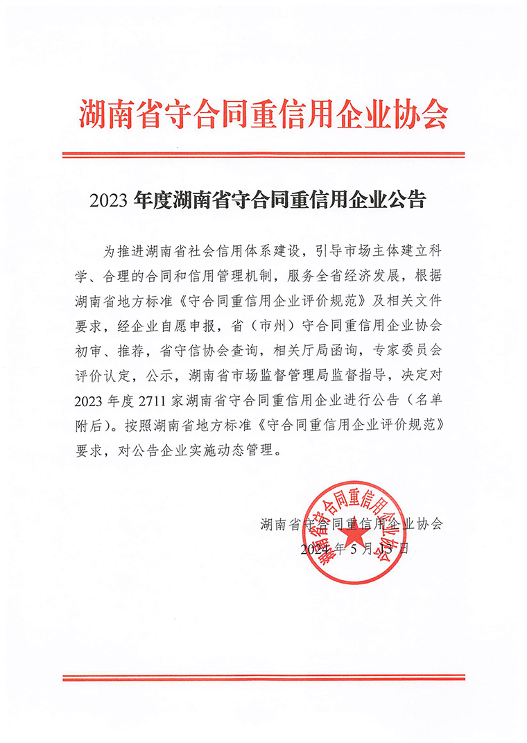 近日,湖南省守合同重信用企业协会、长沙市守合同重信用企业协会分别发布了《2023年度湖南省守合同重信用企业公告》《2023年度长沙市守合同重信用企业公告》。安博官网凭借完善的企业诚信建设体系与科学的企业管理水平连续第16次荣登榜单,被授予“湖南省守合同重信用企业”“长沙市守合同重信用企业”荣誉称号。