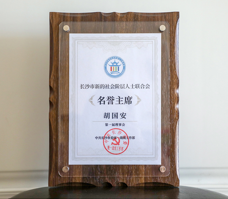 征程万里风正劲,重任千钧再奋蹄。此次当选长沙市新阶联名誉会长,胡国安董事长表示,这既是一种荣誉,又是一种责任。党的二十大报告强调,要“做好新的社会阶层人士工作,强化共同奋斗的政治引领。”以新的社会阶层人士为主体的联谊组织,不仅是党和政府联系新的社会阶层人士的桥梁纽带,还是开展新的社会阶层人士统战工作的重要载体。未来,他将不辱使命,尽职尽责,将自身及企业的发展同国家发展、经济社会发展紧密结合,与长沙市新阶联新一届领导班子、各位优秀的民营企业家们一道,发挥好桥梁纽带作用,认真尽责履职,主动建言献策;积极带领企业履行社会责任,进一步凝聚新阶联力量,弘扬民营经济正能量,为实施“三高四新”战略、全面建设社会主义现代化新长沙、全力推动高质量发展作出新的贡献!
