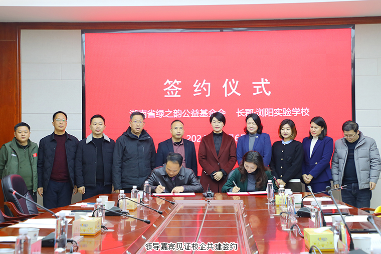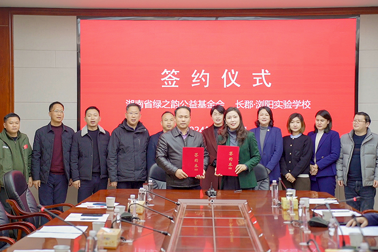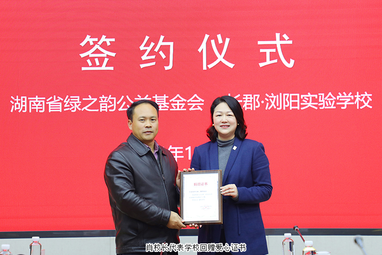 在现场领导嘉宾的见证下,蒋文秘书长代表绿之韵公益基金会与长郡浏阳实验学校签订校企共建协议,未来3年将陆续向学校捐赠30万元专门设立爱心助学奖学金,重点帮扶在校困难学生,改善他们的生活和学习环境。随后,劳嘉理事长向长郡浏阳实验学校捐赠爱心支票,肖校长代表学校回赠爱心证书。