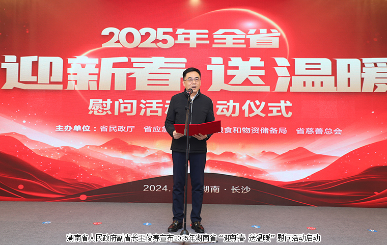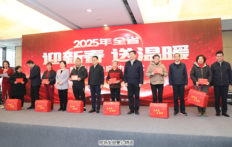 随后,湖南省人民政府副省长王俊寿、湖南省人民政府办公厅一级巡视员孟祥定,湖南省民政厅厅长黄东红,中共湖南省委宣传部二级巡视员杨勇,湖南省应急管理厅党委委员、副厅长朱毅,湖南省粮食和物资储备局党组成员、副局长覃世民等领导上台为困难群众代表发放爱心物资。湖南省人民政府副省长王俊寿宣布2025年湖南省“迎新春 送温暖”慰问活动正式启动。