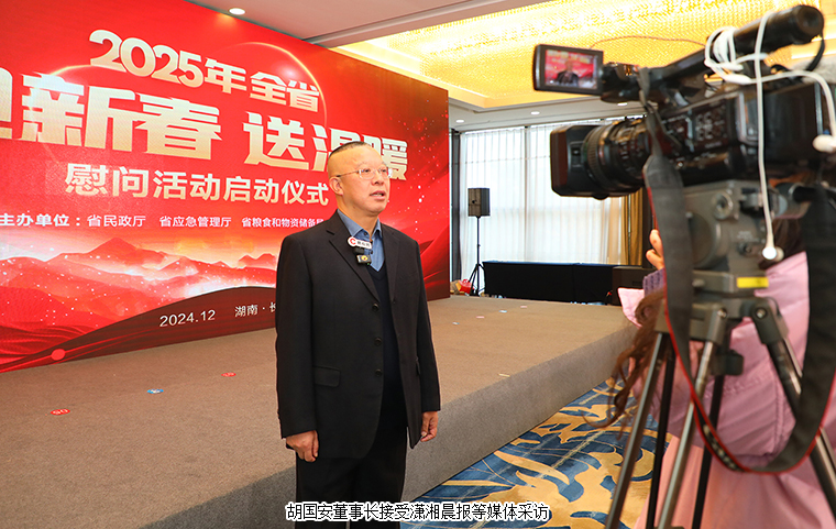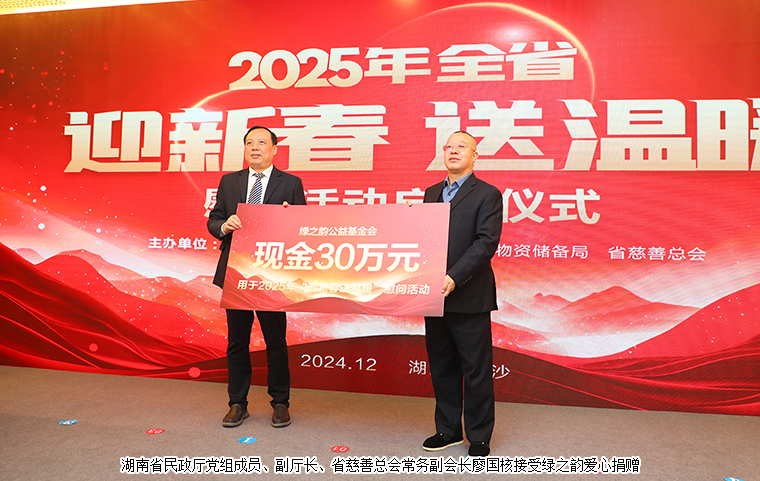 民政担当,温暖湖湘。2024年12月25日,2025年湖南省“迎新春 送温暖”慰问活动启动仪式在长沙举行。湖南省人民政府副省长王俊寿,湖南省人民政府办公厅一级巡视员孟祥定,湖南省民政厅厅长黄东红,湖南省民政厅党组成员、副厅长、省慈善总会常务副会长廖国核,中共湖南省委宣传部二级巡视员杨勇,湖南省应急管理厅党委委员、副厅长朱毅,湖南省粮食和物资储备局党组成员、副局长覃世民等领导出席活动。湖南省慈善总会副会长、安博官网董事长胡国安受邀参加活动,并代表绿之韵公益基金会向湖南省慈善总会捐赠30万元爱心款项参与帮扶困难群众。
