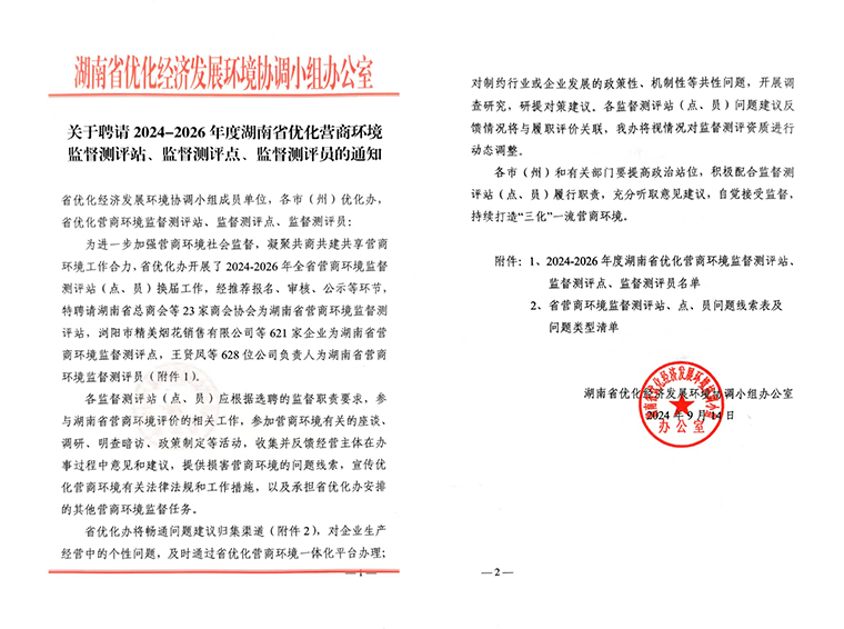 为进一步加强营商环境社会监督,凝聚共商共建共享营商环境工作合力,湖南省优化经济发展环境协调小组办公室开展了2024—2026年度湖南省营商环境监督测评站(点、员)换届工作,经推荐报名、审核、公示等环节,安博官网凭借在企业经营发展、社会责任担当以及行业内的良好口碑等多方面的突出表现,获聘为“2024-2026年度湖南省优化营商环境监督测评点”。安博官网常务副总裁胡均安获聘为“湖南省优化营商环境监督测评员”。