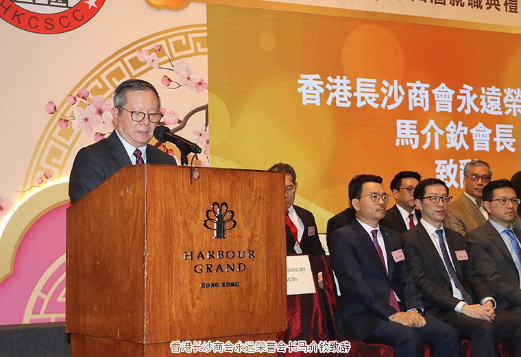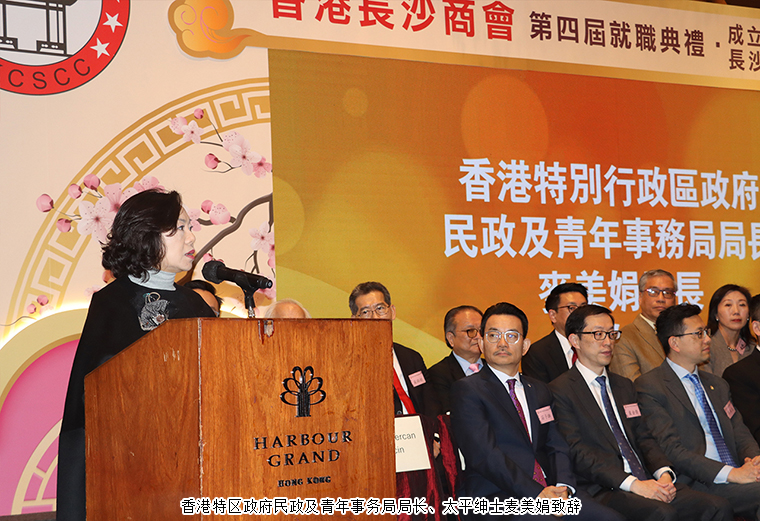 香港特区政府民政及青年事务局局长、太平绅士麦美娟致辞。她表示,香港与长沙在金融领域联系紧密。特区政府将配合国家发展战略,加强与湖南的合作,支持湖南企业以香港为平台拓展国际市场。她肯定了香港长沙商会在团结乡亲、支持家乡发展及参与香港社会建设方面的贡献,并期望商会在新一届领导集体的带领下,继续发挥桥梁作用,助力香港把握经济转型机遇,推动国家高质量发展。