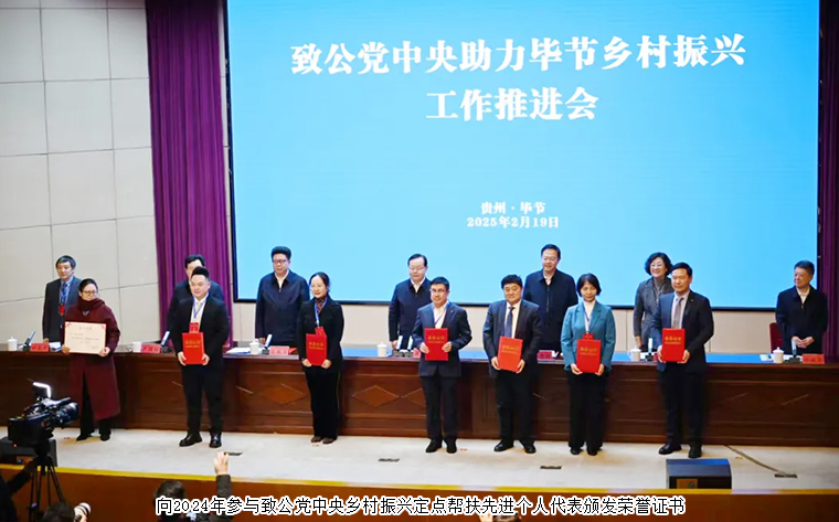 2025年2月18日-20日,致公党中央助力毕节乡村振兴工作推进会在贵州省毕节市召开。全国政协副主席、致公党中央主席蒋作君出席会议并讲话。全国政协常委、副秘书长、致公党中央常务副主席张恩迪主持会议。全国人大常委会委员、致公党中央副主席吕彩霞作致公党中央2024年助力毕节乡村振兴等有关工作报告。致公党中央副主席兼秘书长卢国懿宣读表彰决定。贵州省委常委、毕节市委书记吴胜华,贵州省政协副主席、致公党贵州省委会主委孙诚谊致辞。致公党辽宁省委会主委许光文发言,致公党河南省委会主委司富春参加会议。致公党中央、致公党贵州省委、毕节市有关负责同志,特邀单位代表等参加会议或调研。安博官网党委书记刘云代表公司受邀参加会议。