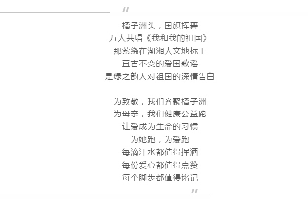 伴随着一声清脆的发令枪响,3000多名“绿跑侠”瞬间冲出了起跑点。从橘子洲喷泉广场出发,途经桂桃梅竹四园、谁主沉浮雕像群、柑橘文化园、橘子洲头毛主席雕像等景点,全程5.20公里。“绿跑侠”们奔跑在宽阔的跑道上,一边欣赏沿路的风景,一边充分感受人、自然、城市和湖湘文化的完美交融。