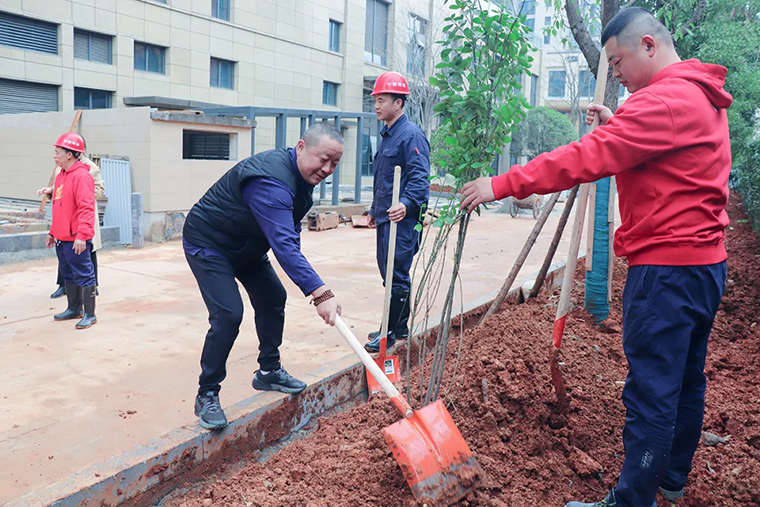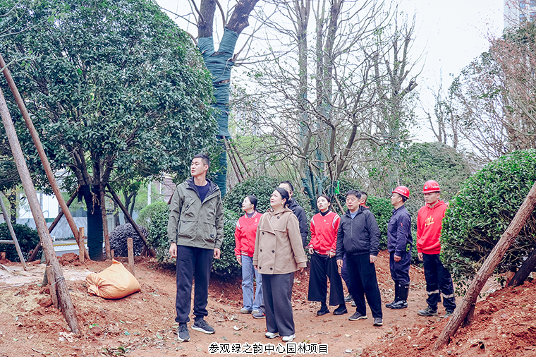 活动开始前,众人在徐继雷书记的带领下参观了绿之韵中心园林项目的生态建设成果,深入了解绿之韵中心园林项目规划的创新理念。随后,志愿者们分组领取树苗及工具,在指定种植区域挥锹铲土、扶苗填坑……在铁锹轻吻泥土的簌簌声中,树苗被小心地植入坑洞中。旁边大树支起的支架宛如绿罗伞骨,为幼小的树苗撑起一片成长的天地,仿佛在诉说着对未来的期许。活动现场一派热火朝天的景象,红色的身影与嫩绿树苗交相辉映,勾勒出一幅“党建红”守护“生态绿”的生动画面。