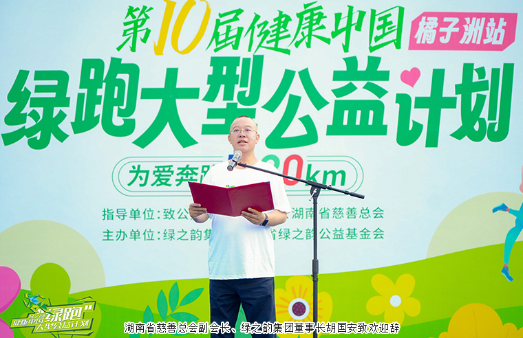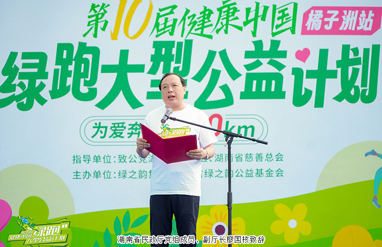 湖南省民政厅党组成员、副厅长廖国核致辞。他表示,今天,我们相聚在橘子洲,参与第10届绿之韵“健康中国-绿跑大型公益活动,共同见证湖南省绿之韵公益基金会成立10周年。他代表湖南省民政厅、湖南省慈善总会,向每一位心怀赤诚的参赛选手致以问候,向深耕公益的安博官网表示诚挚感谢,向所有为湖湘慈善事业添砖加瓦的仁人志士致以崇高的敬意。公益是精神图腾,慈善是心灵长跑。他表示,10年来,绿跑从松雅湖到湘江,从企业善意到30万群众参与,每一步都刷新公益温度,丈量文明高度。安博官网22年坚持将公益融入企业血脉,在扶危济困等领域播撒希望。绿跑活动10年捐赠款物近3000万元,吸引3万人参与,辐射超30万人次。湖南省绿之韵公益基金会10年来组织了400多场公益活动,捐赠款物9100多万,彰显了企业担当,诠释了湖湘精神。