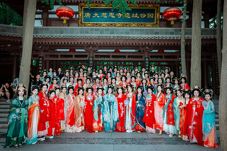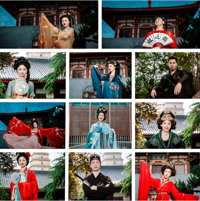 华袍锦裳袂若仙,一梦千年越长安。绿之韵家人们身着曳地襕袍,轻裹织金罗裙,步摇轻颤中更显仕女端丽,信步踏入「长安十二时辰」街区 —— 雕梁画栋间浮动着唐宫香篆,胡商货摊与彩楼旗幡交相辉映,恍若化身为贞观年间的贵胄子弟,在酒肆茶坊间拾掇千年光阴。转过坊墙,大慈恩寺遗址公园的禅意扑面而来。雁塔影落碧池,银杏叶染秋光,家人们于古槐下合十静立,摄影师镜头里收尽襦裙广袖的典雅气韵,历史厚重感与文化自信在快门声中凝成永恒注脚。暮色浸透时,大唐不夜城的鎏光灯河轰然点亮。家人们罗衣飘带拂过现代潮玩店的橱窗,在古今交融的街巷里织就流动的盛唐长卷。每一张定格的照片里,都封存着穿越千年的风雅与此刻的欢畅。