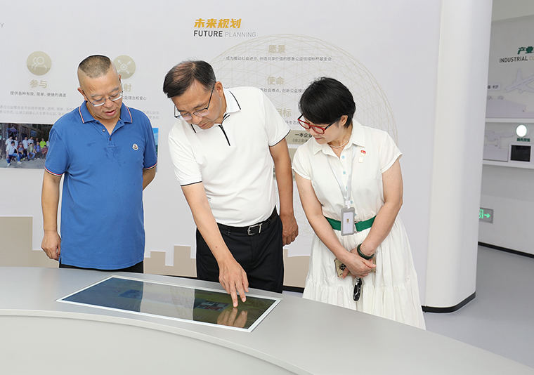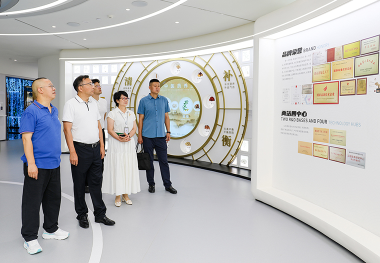 随后,调研组一行来到位于绿之韵中心17层的数智化科技展厅。展厅设计深度融入企业 “水之道” 理念,以水的旅程为叙事主线,将企业初心与情怀贯穿始终,同时融合 “东哲西技” 概念,展现独特的文化底蕴。展厅运用数字技术打造互动体验,构建智慧型新时代中医药文化展示空间,通过立体空间多维度呈现集团企业文化、发展历程、党建公益、产品理念、科研实力及未来愿景等内容。在参观过程中,胡国安董事长向调研组详细介绍了企业发展脉络,展厅内丰富的最新科技成果与创新产品,更是直观展现了绿之韵在大健康领域的积极探索与阶段性成果。