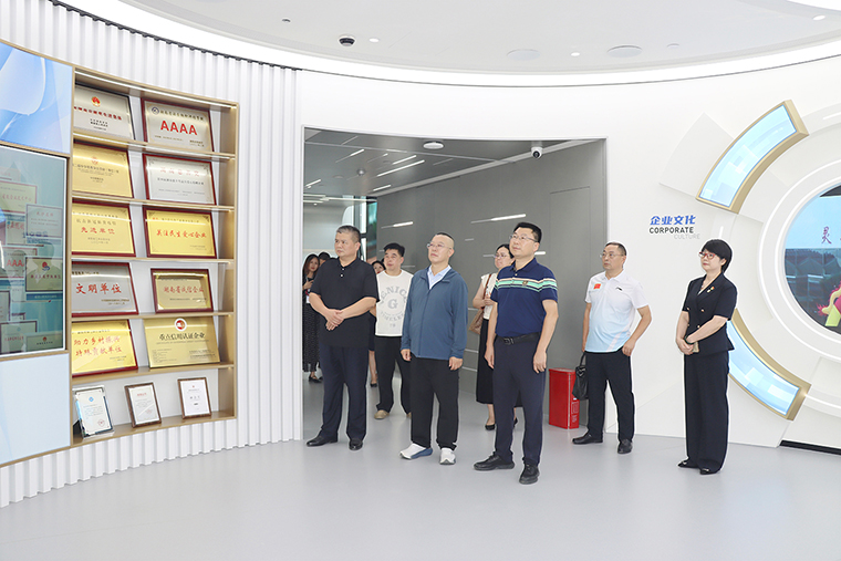 调研组一行先后参观了绿之韵中心园林景观和17层数智化科技展厅。展厅设计深度融入企业“水之道” 理念,以水的旅程为叙事主线,将企业初心与情怀贯穿始终,同时融合“东哲西技”概念,展现独特的文化底蕴。展厅运用数字技术打造互动体验,构建智慧型新时代中医药文化展示空间,通过立体空间多维度呈现集团企业文化、发展历程、党建公益、产品理念、科研实力及未来愿景等内容,直观展现了绿之韵在大健康领域的积极探索与阶段性成果。