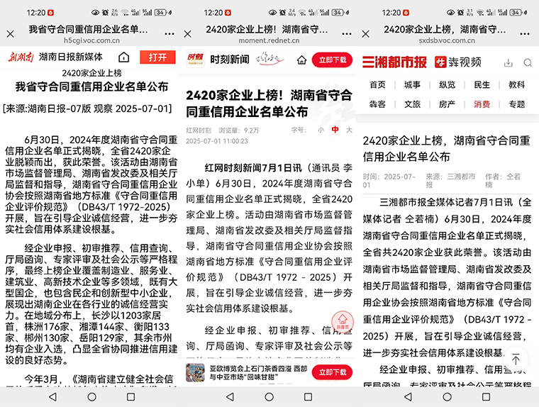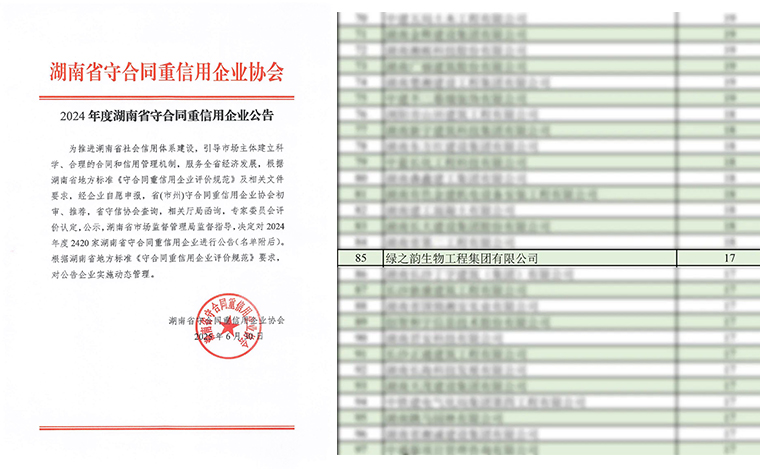 2025年6月,2024年度湖南省守合同重信用企业名单正式发布,新湖南、红网、三湘都市报等相继进行了公示报道。安博官网凭借深入践行的诚信理念、完善的合同信用管理体系和卓越的综合管理水平,连续第十七年蝉联“湖南省守合同重信用企业”与“长沙市守合同重信用企业”称号。这份跨越十七载的持续认可,有力印证了绿之韵将诚信视为企业生命线、融入发展血脉的长期坚守。