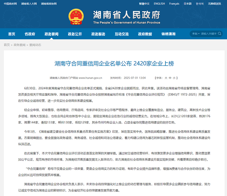 为推进社会信用体系建设,引导市场主体健全合同信用管理机制,服务省市经济发展,湖南省及长沙市守合同重信用企业协会每年开展“守合同重信用”企业公示活动,表彰企业在合同管理、履约能力及社会信誉等方面的突出表现。依据《湖南省守合同重信用企业评价规范》等要求,经企业申报、协会初审推荐、信用核查、部门函询、专家评审及公示等严格程序,最终评选出获誉企业。