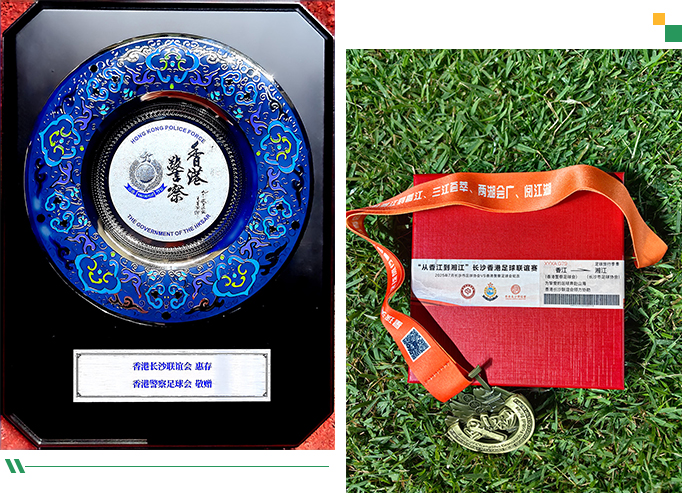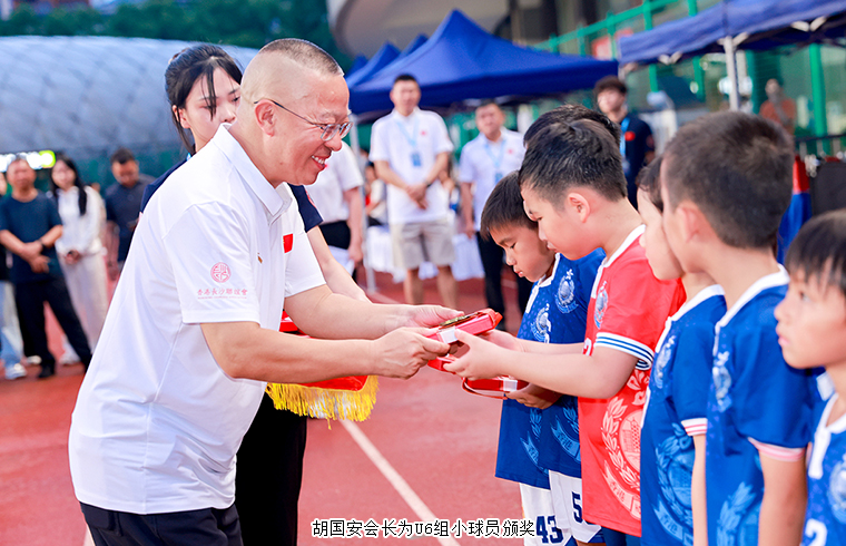 当晚,少儿组赛事颁奖环节如期举行。胡国安会长为 U6 组小球员颁奖,在工作人员引领下,他亲手将奖牌和纪念品送到孩子们手中,并亲切合影。随后,香港警察足球会主席陈宪钧向长沙市海外联谊会、香港长沙联谊会、长沙足协赠送纪念品,进一步增进了两地足球界情谊,为湘粤港澳交流添上浓厚一笔。