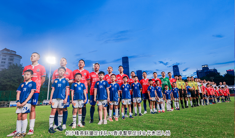 19:30,长沙精英联盟足球队VS香港警察足球会代表团入场式拉开帷幕。国旗飘扬中,球员们牵着球童步入赛场,庄严的国歌奏响,现场氛围庄重热烈。长沙市海外联谊会会长刘汇在长沙市足协主席魏华松陪同下,与首发球员亲切握手并为本场比赛开球,随着足球踢出,这场备受瞩目的比赛正式开启。