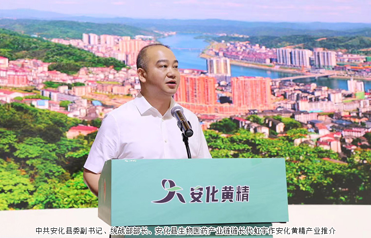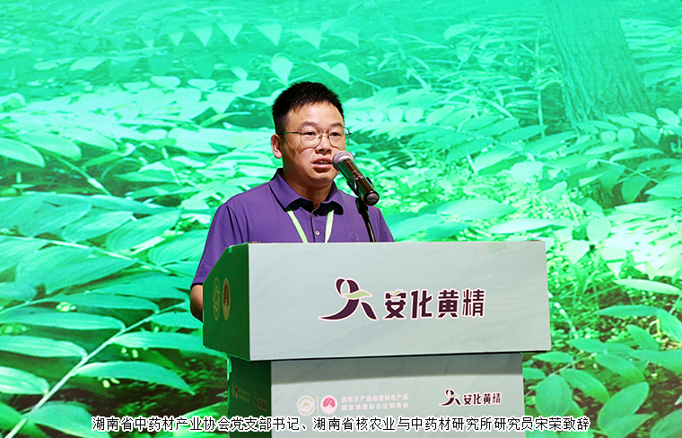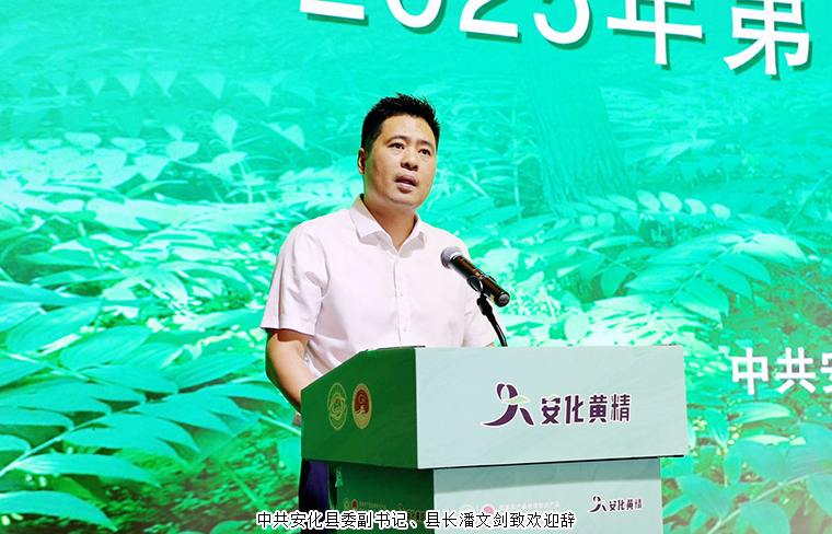大会在共同观看安化黄精产业宣传片中拉开序幕。中共安化县委副书记、县人民政府县长潘文剑致欢迎辞。他表示,近年来,安化以“把黄精当宝贝、把产业当事业”的决心,沿着“培育主体、精深加工、药旅融合、延链强链”四条主线深耕细作,推动黄精产业从“山间草药”成长为“富民金草”。2024年,全县中药材种植面积达37.9万亩,综合产值突破56亿元;其中黄精种植基地12.55万亩,产值32.1亿元,辐射带动12.8万农户增收致富。培育出10家规上企业、7家省级高新技术企业,建成全省唯一黄精道地药材良种繁育中心,60余款特色产品走出国门;“安化黄精”更是一举斩获“国家农产品地理标志、国家地理标志证明商标、国家地理标志产品”三项国字号荣誉,入选农业农村部农耕农品记忆索引和全国名特优新农产品名录,成为全国多花黄精种植面积最大的县,位列“湘黄精”核心产区第一位。