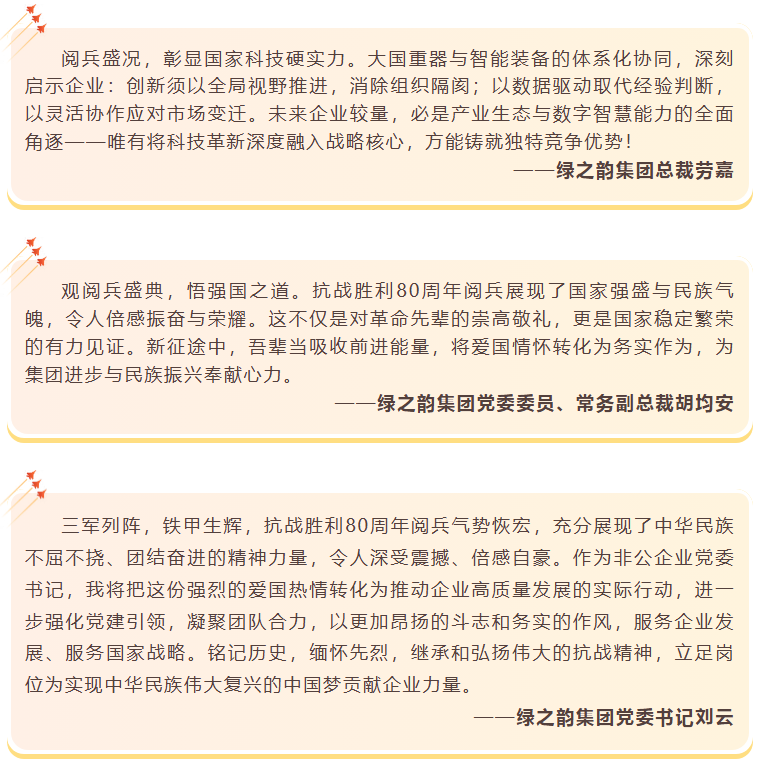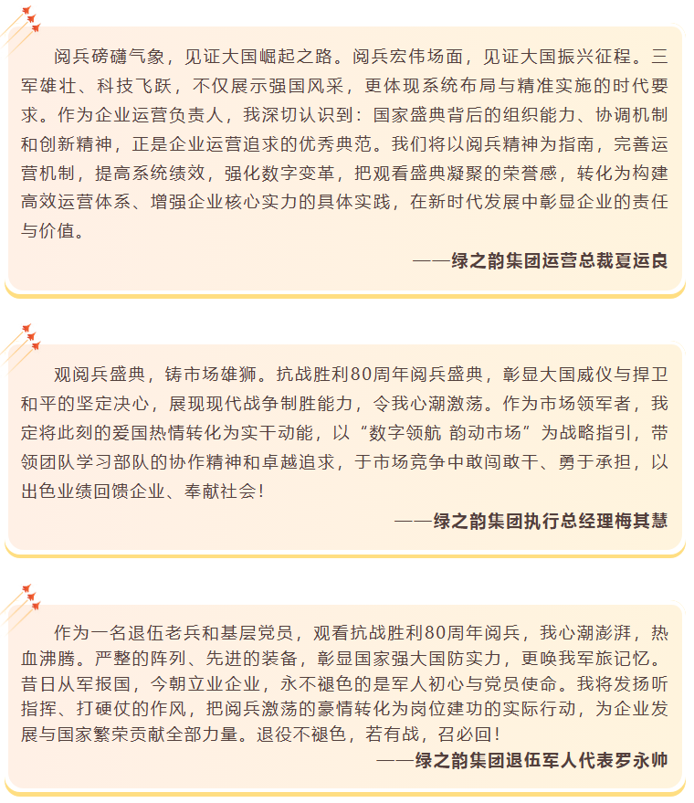 此次阅兵是展示国家强大国防力量、彰显民族精神的重要仪式,更是全体党员接受思想洗礼、强化使命担当的生动课堂。观看过程中,全体绿之韵人全神贯注,共同回顾那段烽火岁月,缅怀革命先烈,感受强国强军的时代脉动,接受了一次深刻的爱国主义教育和精神洗礼。大家纷纷表示,看到受阅官兵威武雄壮的英姿和新型武器装备的先进强大,民族自豪感油然而生,为祖国今日之强大倍感骄傲,决心以此次观看学习为新的起点,将内心的震撼与感动转化为扎实工作的强大动力,不断开创工作新局面。