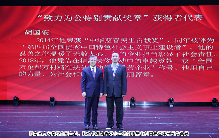 演出前举行了隆重的“致力为公”奖章颁奖仪式。在热烈的掌声中,胡国安董事长上台接受“致力为公”特别贡献奖章。颁奖辞写到:“2014年他荣获‘中华慈善突出贡献奖’,同年被评为‘第四届全国优秀中国特色社会主义事业建设者’。他的慈善之举温暖了无数人心,他的企业担当彰显了社会责任。2018年,他凭借在精准扶贫行动中的卓越贡献,获‘全国万企帮万村精准扶贫行动先进民营企业’称号。他用自己的力量,为社会和谐发展书写壮丽篇章。”此项荣誉正是对他多年来在参政议政、社会服务、侨海联络,特别是在公益慈善与乡村振兴等领域持续贡献的高度认可,充分体现了致公党湖南省委会对优秀党员坚守“致力为公、侨海报国”初心的肯定与褒扬。