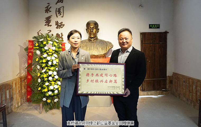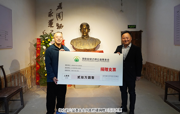 绿之韵公益基金会向长沙县高桥镇政府捐赠20万元用于乡村振兴产业建设,助力村镇集体经济增长、改善乡民生产生活环境,也将专项支持本地红色文化的保护与传承。