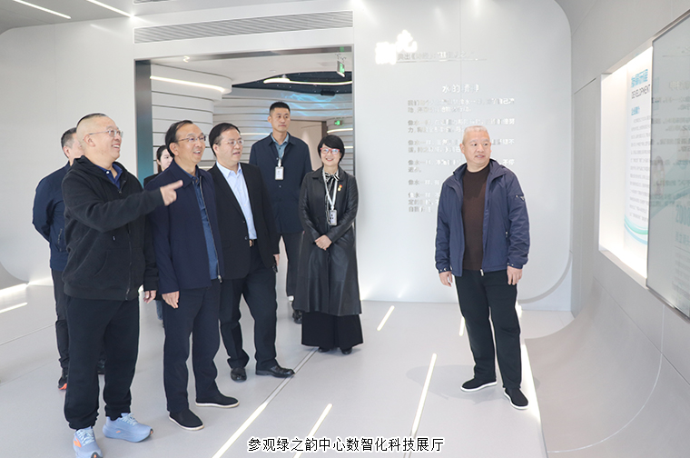 调研组随后参观了绿之韵中心数智化科技展厅。展厅以“水之道”为企业文化内核,融合东方哲学与数字技术,通过数字化互动技术和智慧展陈手段,立体呈现了安博官网的企业文化、发展历程、党建公益、产品理念、科研实力及战略愿景。胡国安董事长向调研组介绍了企业在产品研发与产业拓展方面的创新实践,展现了绿之韵在大健康领域的持续探索与成果。