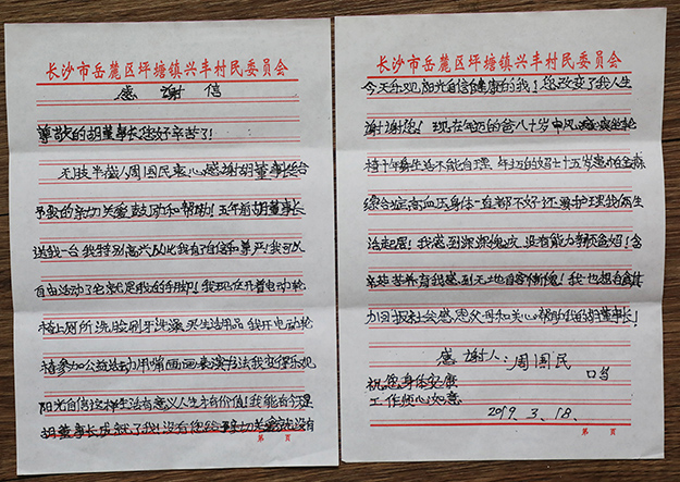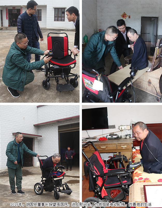 书桌前画画、写字磨过了他大半辈子的时光,四季轮回更迭,周国民愈加向往外面的世界,渴望更真实地去感受阳光和风,渴望与更多人交流,感受这个世界的温度。2015年11月,绿之韵公益基金会得知这一情况,为周国民送去了电动轮椅。胡国安董事长亲自去探望周国民,将轮椅组装好,并耐心指导他使用,圆了他的自由行动梦。