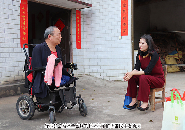 温暖四月,万树繁花。绿之韵公益基金会秘书长蒋文、副秘书长肖波与绿之韵爱心志愿者再次来到长沙望城县兴丰村周国民的家。伴随着春天的和风与温暖的阳光,迎接我们的是周国民灿烂的笑脸。与五年前相比,周国民开朗了很多,眼里闪着激动的光,一直说着感谢的话。“感谢绿之韵,感谢胡国安董事长,是你们给了我尊严和自由,给了我第二次生命。”