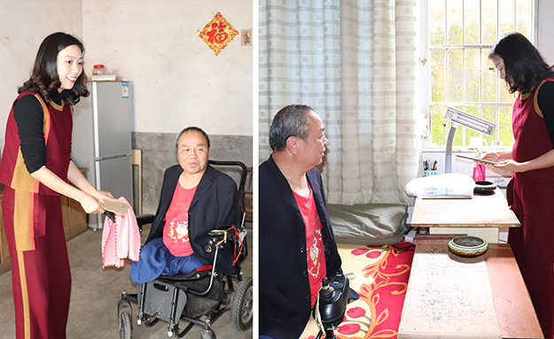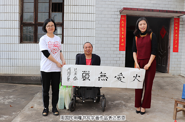 “感谢五年前胡国安董事长的鼓励,现在我用嘴写的书画作品已经成熟很多,我想为胡国安董事长送去我的字画,表达我的感谢与感激。”上善若水、大爱无疆、大展鸿图、大道酬勤……一幅幅字画都是周国民的心声。绿之韵公益基金会秘书长蒋文代表胡国安董事长接过这份沉甸甸的心意礼物,并在了解周国民现在家中80多岁的老父亲已经中风偏瘫,母亲年事已高但照顾着家中大小事情,不仅送去了慰问金和绿之韵生活用品,还专门购置了电饭煲、电磁炉和微波炉等电器,为周国民一家提供更多便利生活。