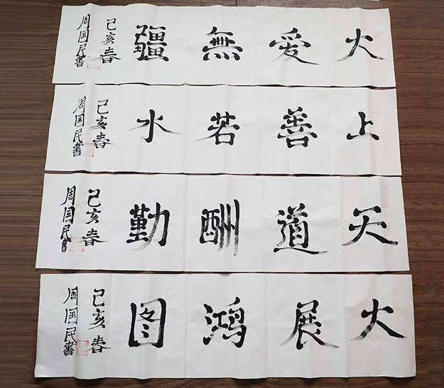出院后,周国民又在床上躺了6年,做过数十次背部的修复手术,才终于能起身。医生说他能活下来就已经是个奇迹。他也曾灰心丧气,但父母的眼泪与子女的期盼让他终于还是挺了过来。没有了手脚,从此,嘴成了他唯一可以使用的工具。在他的房间,他向我们演示自己怎么用嘴脱衣睡觉、穿衣起床,叠被子。他的床头就是他练习用嘴写字画画的案板。没有经过任何的学习,也没有人指点。周国民用嘴一笔笔画画、写字,炎夏、寒冬,他始终坚持着,正常人能够做到的,他只要多花点时间也一定能够做到。