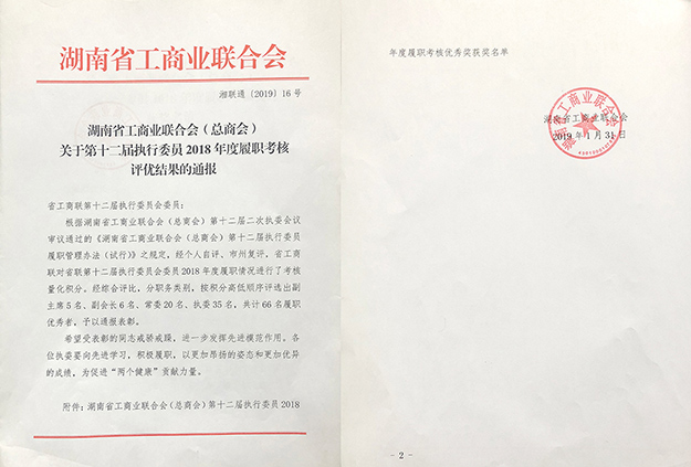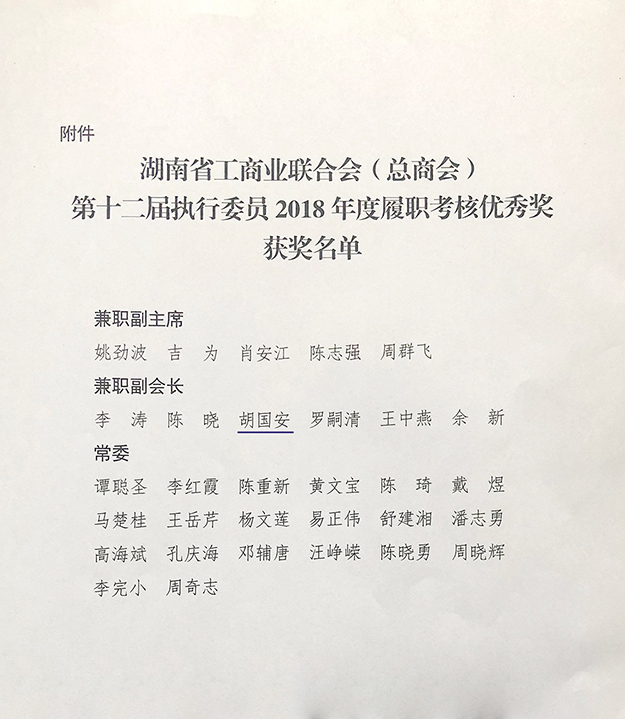 会议审议通过了《关于设立湖南省工商联顾问委员会决定》,《湖南省工商联(总商会)第十二届执行委员会第三次会议选举办法(草案),《湖南省工商联(总商会)第十二届执行委员会第三次会议秘书长、常务委员侯选人名单》,《湖南省工商联(总商会)第十二届执行委员会第三次会议替补执行委员、常务委员侯选人名单》,通报表彰了2018年度执行委员履职优秀副主席、副会长、常委、执委。胡国安董事长获评2018年度履职优秀副会长。
