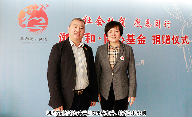 社会扶贫,感恩同行。2019年1月24日,“浏阳和·同心基金”捐赠座谈会在浏阳市举行。中共浏阳市委常委、统战部长郭瑞,浏阳市人大常委会副主任、民革浏阳工委主委刘仙娥,中共浏阳市委统战部常务副部长焦清平,中共浏阳市委统战部副部长、工商联党组书记汤建军,浏阳市安监局党组书记、局长熊湘东,中共浏阳市委统战部副部长、台办主任江涵等领导出席活动。浏阳市委统战部、市安监局、市工商联、市红十字会负责人等参加活动。会上,“浏阳和·同心基金”温暖成立,安博官网捐资10万为爱聚力,安博官网副总裁胡均安参加捐赠仪式。