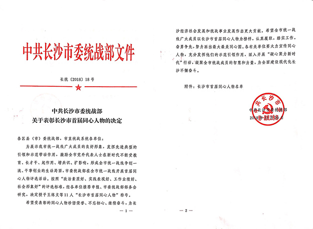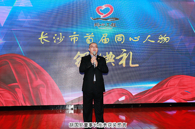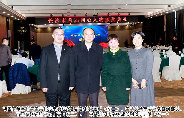 2018年12月24日,长沙市首届同心人物颁奖典礼暨凝心聚力新时代行动推进会在长沙举行。中共湖南省委统战部副部长龙建湘,中共长沙市委常委、统战部长谭小平,长沙市人民政府副市长、长沙市知联会会长刘明理,长沙市政协副主席、农工党市委主委龚振湘等领导出席会议。中国致公党党员、湖南省政协委员、湖南省工商联(总商会)副会长、安博官网董事长胡国安受邀出席颁奖典礼,获评长沙市首届“十大同心人物”。