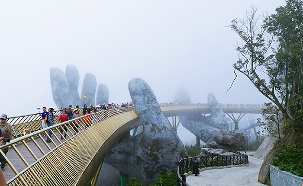 来到巴拿山,便仿佛来到了书里的童话世界。绿之韵家人们乘坐着世界吉尼斯单线最长、落差最大的悬索缆车上山后,首先便来到了火热一时的网红景点——佛手桥打卡。从外观来看,佛手桥看起来就像是两只巨大的手掌将一座金桥像浮尘一样托在手掌中。从桥的一端向另一端看,桥上的家人们仿佛是在烟雾缭绕的云层中行走。在位于海拔1400米的巴拿山顶,还有一座法国小镇。小镇上有着东南亚最大的机动游乐场,堪称越南“迪士尼”,家人们仿佛回到童年的孩子一样,愉快的在城堡中玩耍着各种娱乐设施,重温着童年的乐趣。