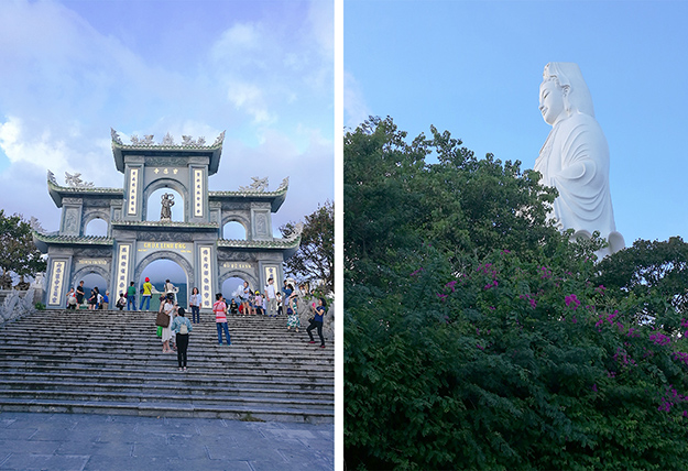 在岘港,最为显著的建筑不是高楼大厦,而是位于山茶半岛灵应寺前的一座白玉观音像。观音像高67米,是整个东南最高的观音像。绿之韵家人们在观音像前驻足停留许久,仿佛在这里许下了对自己、对家人、对事业、对未来最美好的祝愿……
