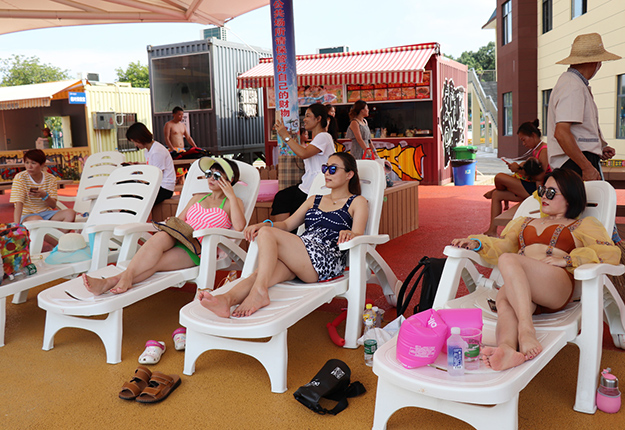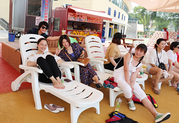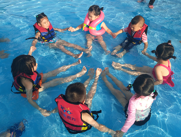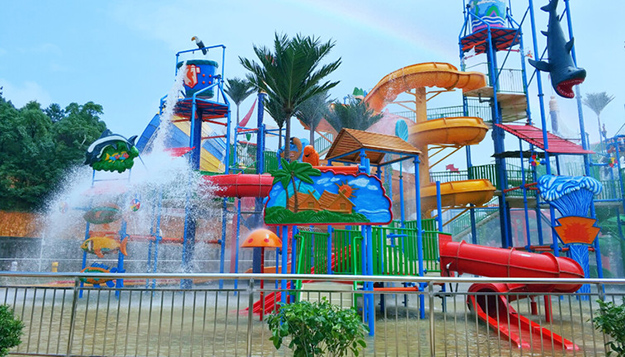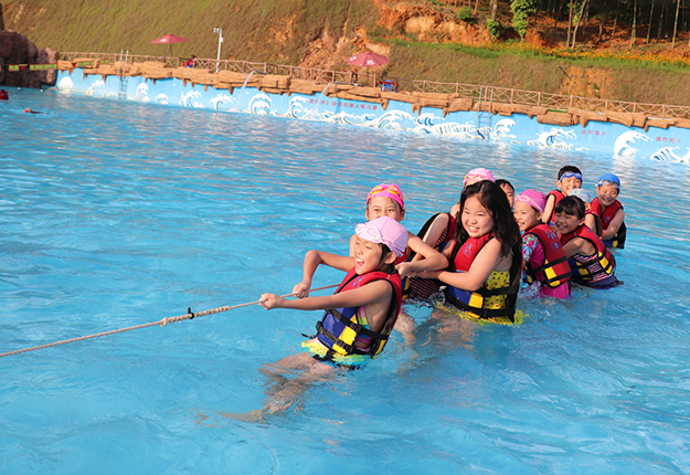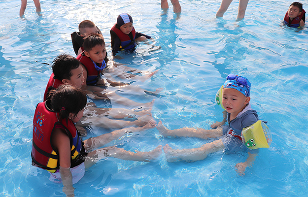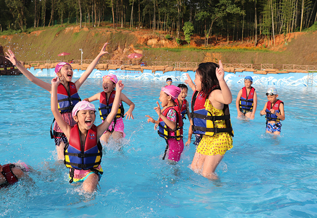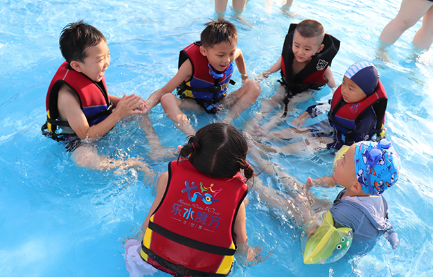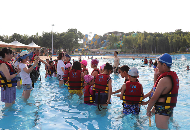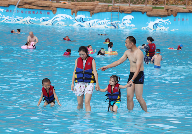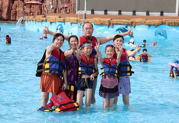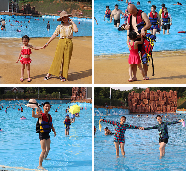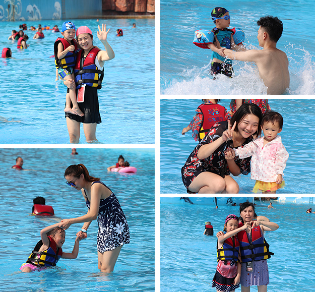 来到园内,家人们换上了美美的泳装与孩子们在水中嬉戏。在水池中,你可以看到妈妈拉着女儿的手,手把手教孩子战胜恐惧学会游泳;浪潮涌来,爸爸守在孩子身后,紧紧抱住孩子的腰,成为宝贝最坚强的护盾;爸爸与女儿从水中上来,地面被烈日晒得滚烫,爸爸让女儿踩在自己的脚上一步一步向前走……家人们与孩子在水中尽情享受着这难得的悠闲下午时光。