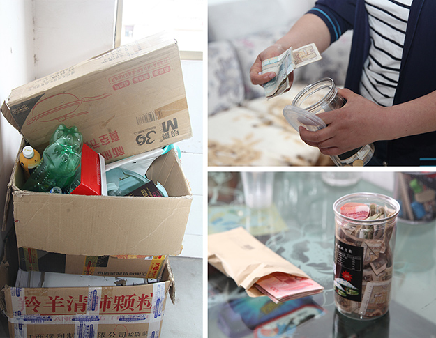 郭秀君说,自从三年前母亲病逝之后,为了照料孩子们的生活和学习,也因为自身的病情,很多工作都做不了,没有固定收入,生活极为困难。社区曾给她安排了环卫工人的工作,刚开始扫大街她就被车撞过一次,现在手上还留有伤痕,但她始终想坚持,有份工作不容易。环卫工作风里来雨里去,她极容易患病发烧,后来实在没办法继续,只能外出时捡捡废品贴补家用。她拿出一个塑料瓶给我们看,里面有一毛、五毛、一块的零钱,加起来也不过几十块钱。那是她平时捡废品卖的钱,每当孩子想要买零食吃的时候,她都会拿出瓶子告诉他们,这是家里所有的钱了。孩子们便默不作声了。尽管说得平静,我们还是看出了她隐忍的泪。虽然是租住的房子,但是家里处处可见这个妈妈的用心,可爱的卡通储蓄罐、粘贴在墙上的孩子们的学习奖状、女儿1.5的小床上还有个一人高的卡通玩偶。郭秀君说,这是女儿最爱的玩偶,也是别人不要了送过来的。