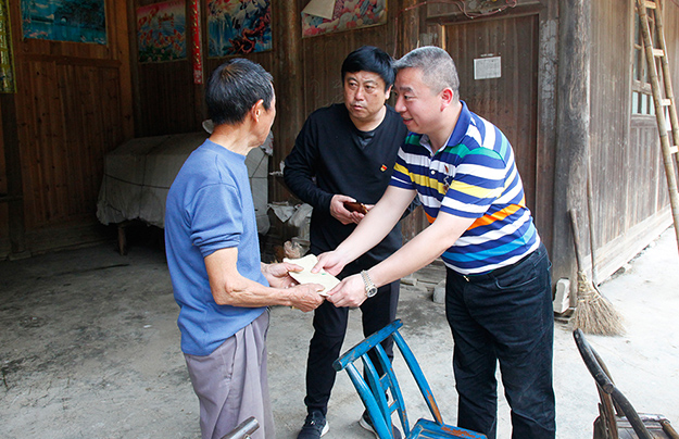 ▲ 2016年2月4日,胡国安董事长带领绿之韵爱心志愿者们再次回到胡家村,为村里的贫困户送来了慰问金、米油和日用品,为乡亲们送上了新春的祝福。