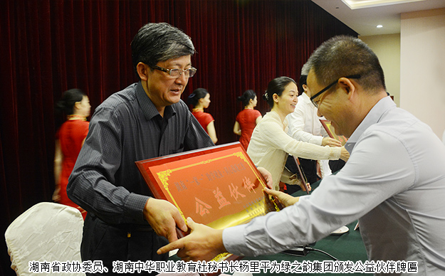 会议期间,举行了湖南省“一家一”助学就业·同心温暖工程“致公系列班”签约仪式,捐资20万建设致公·绿韵生态班,并代表爱心企业发言。