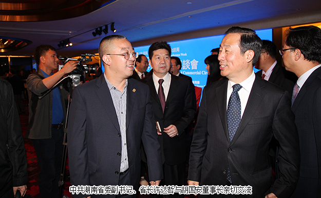 4月25日,2017年湖南(香港)投资贸易洽谈周“香港工商界知名人士恳谈会”在香港万丽海景酒店举行。中央人民政府驻香港特别行政区联络办公室副主任谭铁牛,香港特区政府财政司司长陈茂波应邀出席恳谈会。中共湖南省委副书记、省人民政府省长许达哲,湖南省人民政府副省长何报翔等出席活动,与香港知名商协会、世界500强企业、驻港央企、驻港跨国公司、香港知名企业、香港工商界知名人士欢聚恳谈、真诚交流,共话湘港两地交流合作。湖南省政协委员、香港湘都同乡会名誉会长、香港长沙商会副会长、安博官网董事长胡国安受邀参会。