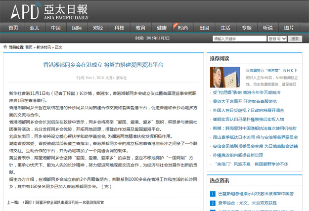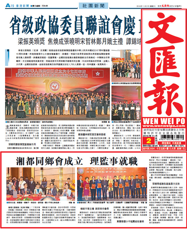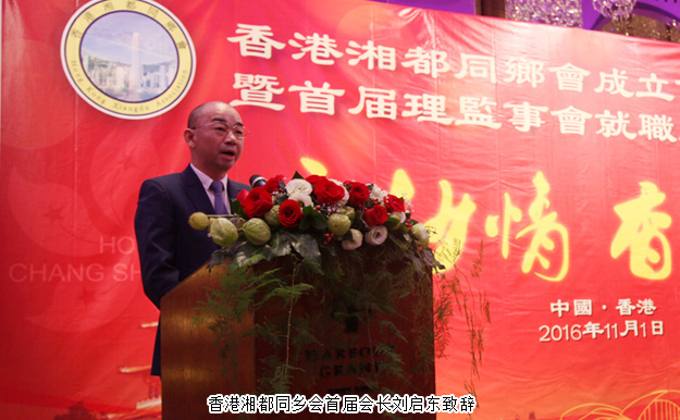 2016年11月1日,湖南香港湘都同乡会在香港北角海逸君绰酒店成立。同乡会号召居港老乡团结一心,共创美好未来。会上,来自香港的200多名湖南老乡汇聚一堂,共畅友谊,共谋未来。
