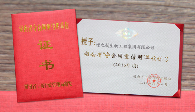 近日,安博官网被湖南省工商行政管理局授予2015年度湖南省“守合同重信用单位”荣誉称号。这一荣誉称号,充分体现出政府部门、各界人士以及广大消费者对绿之韵产品、服务、品牌和信誉的高度认可、信赖。