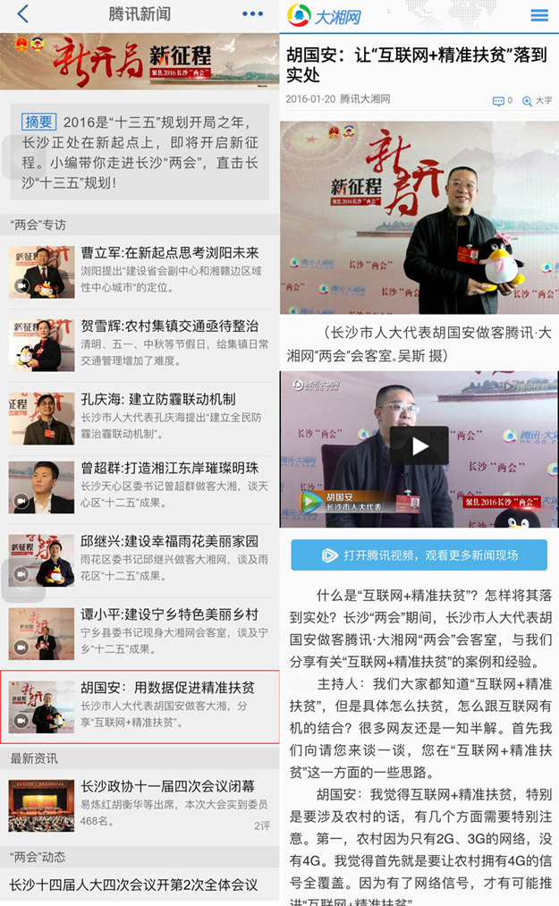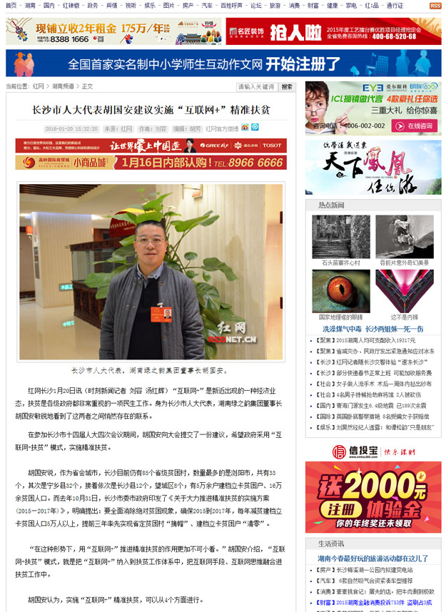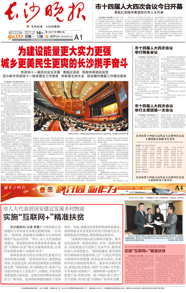 “今年的政府工作报告内容丰富充实,数据精准翔实,部分数字还精确到个位,说明政府对完成目标深有底气。今年,我所提交的人大议案《关于推进‘互联网+扶贫’模式实施精准扶贫的建议》和《关于大力发展乡村物流的几个建议》引起了与会代表和新闻媒体的广泛关注,令我感到十分振奋。互联网能让贫苦地区与市场真正实现无缝隙对接,能够让深藏在大山深处的特色产品走向世界。政府要积极推进互联网+扶贫模式实施精准扶贫,让农村贫苦群众搭上‘互联网+三农’的快车。我对目前安博官网正在积极推进的电子商务战略规划激情满怀,信心百倍。绿之韵将紧紧依靠互联网、移动互联网‘两条腿’走路,构建‘以京津唐’和‘湖南益阳’为南北基点,以遍布全球的10000多家电子商务运营中心为网络的现代物流体系,打造国际一流的湖南本地电商企业,为长沙实现‘率先建成全面小康、加快实现基本现代化’的总目标不懈努力!”胡国安代表在接受腾讯网、长沙新闻频道、红网、长沙政法频道、长沙互动频道、长沙晚报、人大代表报、长沙市人民广播电台等多家媒体采访时,依然沉浸在政府工作报告的兴奋之中。