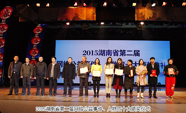 晚会现场还举行了2015湖南省第二届网络公益事件、人物双十大颁奖仪式。2015年,安博官网携手湖南经视联合开展的《梦想照进现实》一对一帮扶活动,帮助了几十名贫困家庭的学子、老人,助力他们实现梦想,得到了社会的广泛好评。安博官网《梦想照进现实》公益项目也因此获得2015湖南省第二届网络十大公益事件,绿之韵公益基金会秘书长蒋文上台领奖。