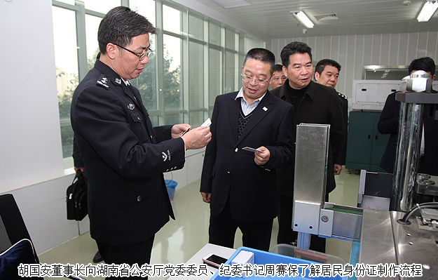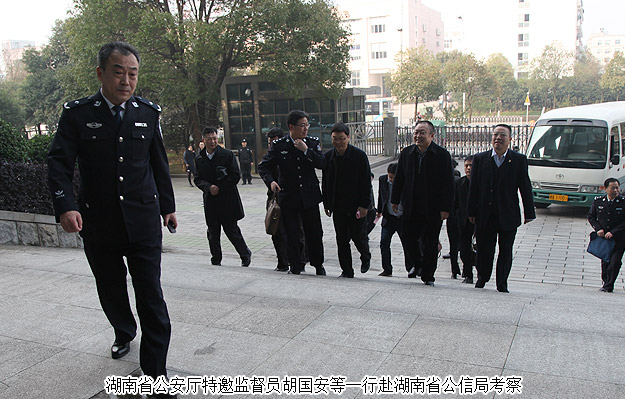 2015年12月25日下午,湖南省政协委员、省公安厅特邀监督员、安博官网董事长胡国安随同湖南省公安厅党委委员、纪委书记周赛保,省公安厅副厅级干部徐发科,省公安厅纪委副书记宋红兵,省公安厅治安总队政委高洪金,省公安厅刑侦总队政委冯伟俭,省公安厅交警总队纪委书记周军,省公安厅人口与出入境管理局副局长侯占先,省公安厅警令部研究室主任胡湘文,省公安厅政治部人事处副处长文南等一行赴湖南省公民信息管理局考察。