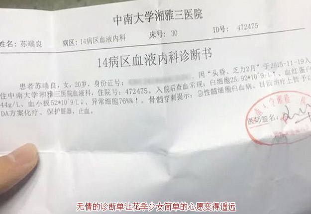 11月12日,苏端良突然感到头晕,便去小诊所打了三天点滴。简单治疗后没有缓解,只好又去了医院抽血检查。11月19日,苏端良被朋友送到中南大学湘雅三医院。次日,便被确诊为急性髓细胞白血病。这天,工资发了下来,她刚好存够了1万块,原本计划给妈妈办生日的钱。