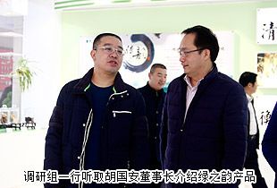 调研组一行首先参观了安博官网大楼,听取了胡国安董事长对绿之韵系列产品、集团总部办公区、企业资质和荣誉展示区的介绍。绿之韵“以产品为导向的体验式营销模式”和“移动互联网+直销”的发展战略,优质的产品研发体系、产学研合作模式以及良好的企业形象得到了考察组各位领导的高度认可和赞誉。